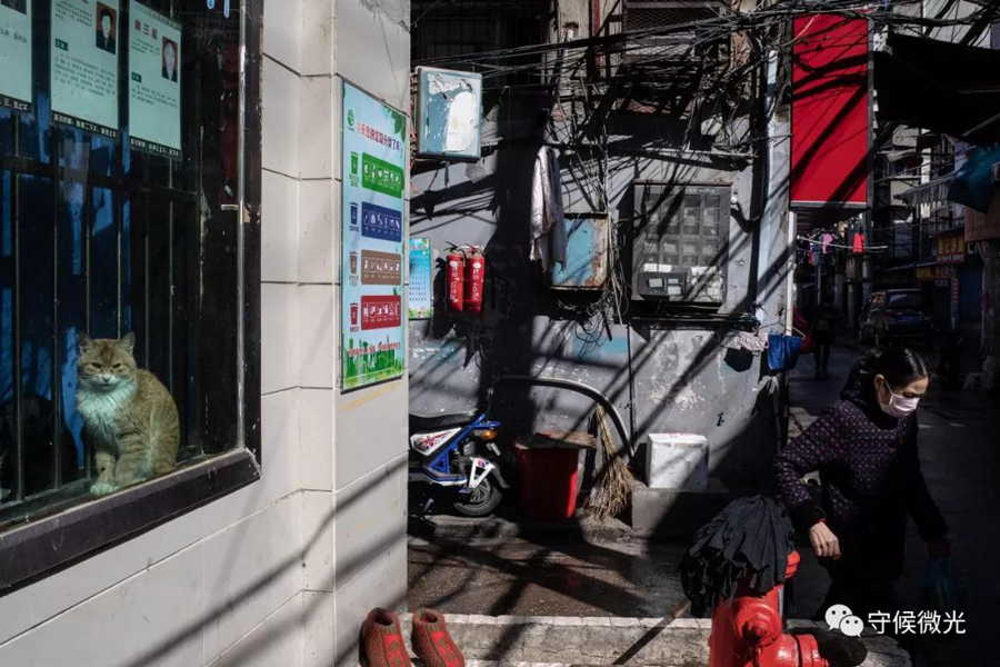 2月16日,湖北省武漢市,民生社區(qū)花樓街,趁著晴天,不少小區(qū)的居民都走出家門,或是采購物資,或是曬曬太陽。中國青年報(bào) 李雋輝/攝