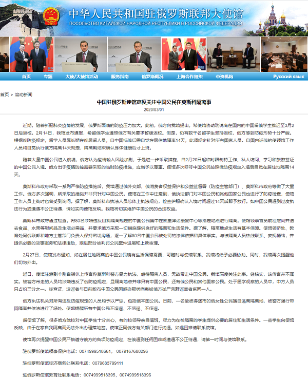 近期,隨著新冠肺炎疫情的發(fā)展,俄羅斯面臨的防疫壓力加大。此前,俄方向我館提出,希使館協(xié)助勸說尚在國內(nèi)的中國留俄學(xué)生推遲至3月2日后返校。2月14日,我館發(fā)布通報(bào),希留俄學(xué)生遵照俄方有關(guān)要求暫緩返校。但是,仍有數(shù)千名留學(xué)生堅(jiān)持返校,俄方感到防疫形勢(shì)十分嚴(yán)峻。根據(jù)俄防疫規(guī)定,留學(xué)人員屬長(zhǎng)期在俄居留人員,自中國抵俄后需自覺在居住地隔離14天,此項(xiàng)規(guī)定針對(duì)所有國家人員。自國內(nèi)返俄的使領(lǐng)館工作人員均自覺執(zhí)行俄方隔離14天規(guī)定,隔離期結(jié)束確認(rèn)身體健康后才上班。