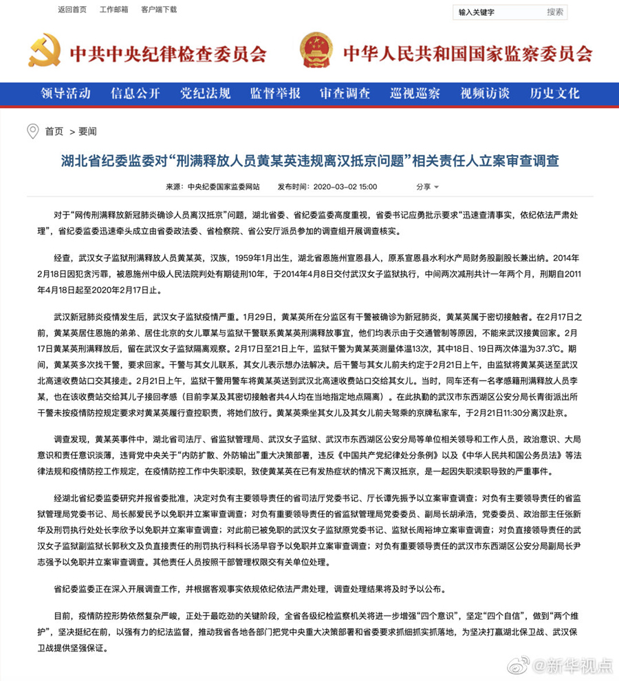 對于“網(wǎng)傳刑滿釋放新冠肺炎確診人員離漢抵京”問題,湖北省委、省紀委監(jiān)委高度重視,省委書記應勇批示要求“迅速查清事實,依紀依法嚴肅處理”,省紀委監(jiān)委迅速牽頭成立由省委政法委、省檢察院、省公安廳派員參加的調查組開展調查核實。