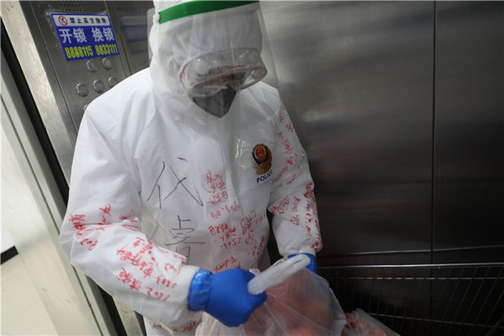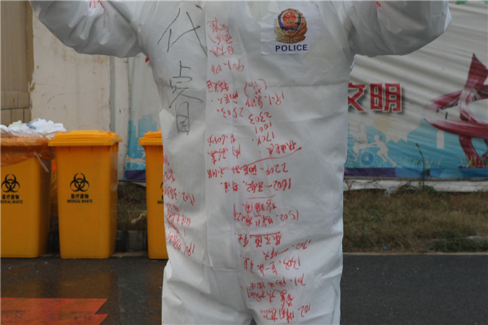 用紅色簽字筆寫(xiě)在防護(hù)服上醒目的位置