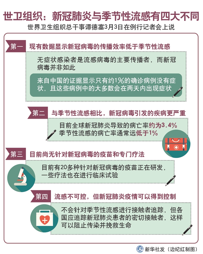 世界衛(wèi)生組織總干事譚德塞3日在例行記者會上說,世衛(wèi)組織正在加深對新冠肺炎的認識,并發(fā)現(xiàn)它與季節(jié)性流感存在4個重要區(qū)別。