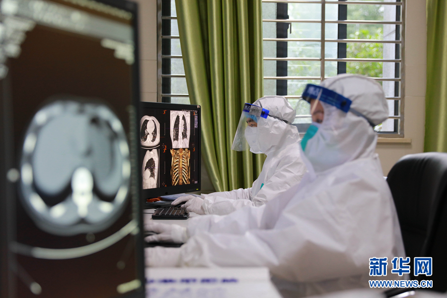 2月26日,湖北省榮軍醫(yī)院放射科主任龔文松(左)、肖顏查看病人CT結果。 新華社發(fā)(朱玲玲 攝)