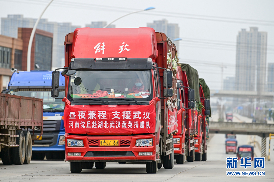 3月1日,河南沈丘退伍老兵王國輝帶隊第三次來到武漢送菜,將沈丘縣委縣政府采購的130噸農(nóng)副產(chǎn)品捐贈給武漢。 新華社發(fā)(侯建勛 攝)