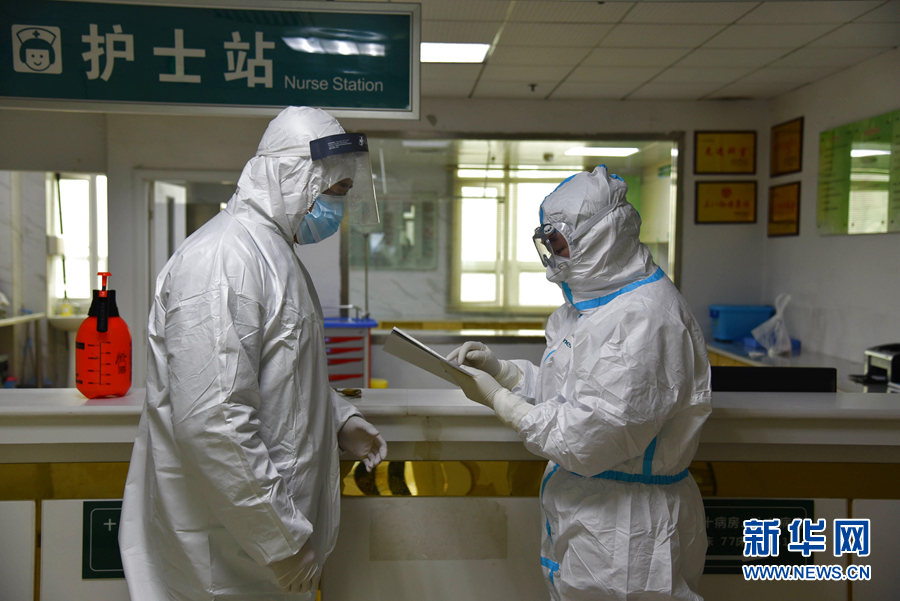 2月13日,湖北省榮軍醫(yī)院黃海明醫(yī)生(左)與退役軍人事務系統(tǒng)援助湖北醫(yī)療隊隊員、江西省榮軍醫(yī)院醫(yī)生、退役軍人晏鑫鵬做工作交接。 新華社發(fā)(朱玲玲 攝)