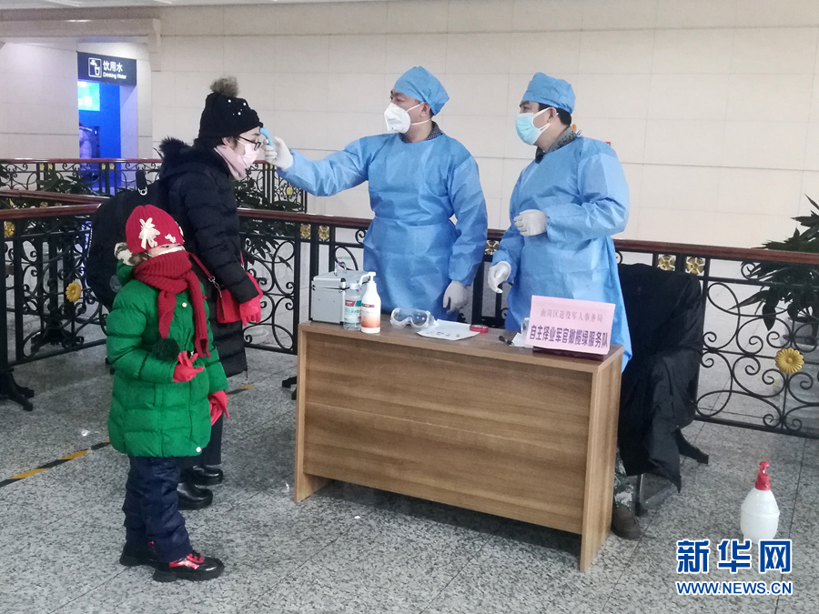 2月14日,黑龍江哈爾濱68名自主擇業(yè)軍轉干部組成的“橄欖綠疫情防控志愿服務隊”隊員在火車站為旅客測量體溫。 新華社發(fā)(韓振忠 攝)