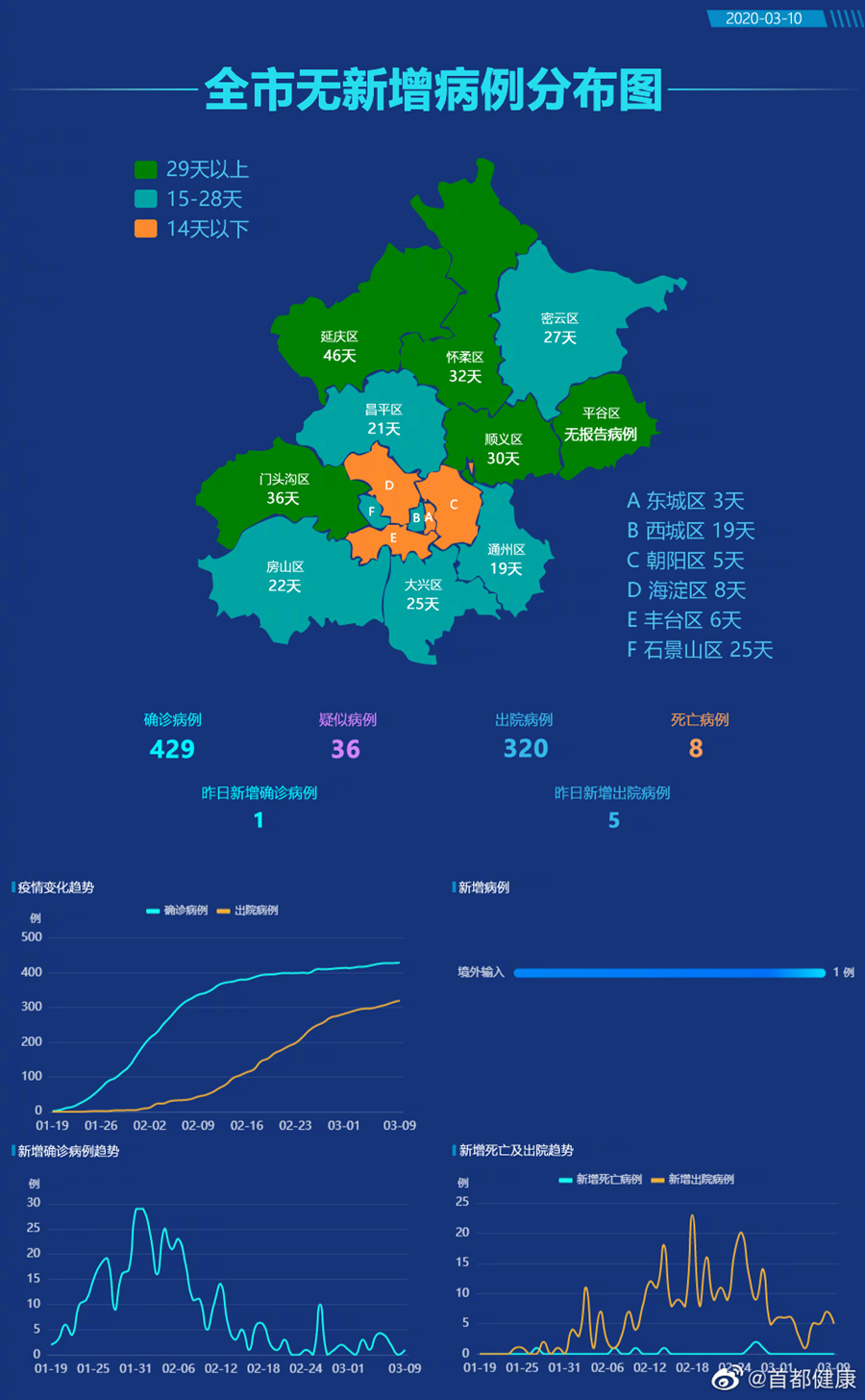 截至3月9日24時,累計確診病例429例,治愈出院病例320例,死亡病例8例。現(xiàn)有疑似病例36例。累計確定密切接觸者3650人,其中467人尚在隔離醫(yī)學(xué)觀察中。確診病例中東城區(qū)14例、西城區(qū)53例、朝陽區(qū)72例、海淀區(qū)63例、豐臺區(qū)43例、石景山區(qū)14例、門頭溝3例、房山區(qū)16例、通州區(qū)19例、順義區(qū)10例、昌平區(qū)29例、大興區(qū)39例、懷柔區(qū)7例、密云區(qū)7例、延慶區(qū)1例,平谷區(qū)尚未有病例,外地來京病例25例,境外輸入病例14例。