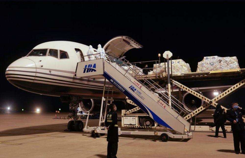工作人員在武漢天河機(jī)場(chǎng)搬運(yùn)醫(yī)療物資(新華社記者 程敏 攝)
