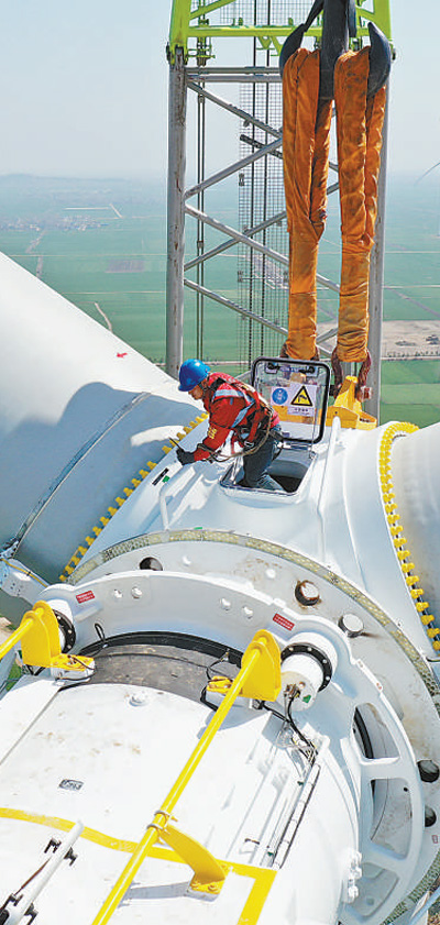 3月15日,在安徽省亳州市蒙城縣,華能風(fēng)電項(xiàng)目復(fù)工后的第七臺風(fēng)機(jī)順利吊裝。胡衛(wèi)國攝(影像中國)