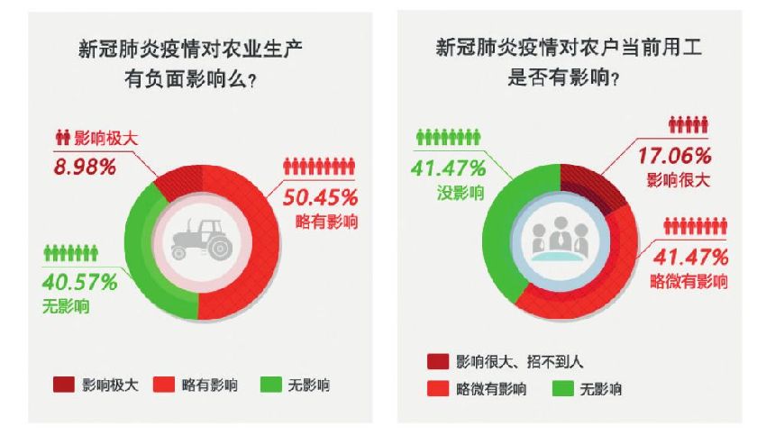 557份有效問卷數據顯示,8.98%的農戶認為疫情對農業(yè)生產負面影響極大,50.45%的農戶認為略有影響。在疫情對用工影響上,17.06%的農戶反映影響大、招不到人,41.47%的農戶認為略微有影響。(見圖1)