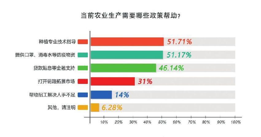 加強農技指導,給予金融支持。問卷調查中農戶提出多項政策需求,51.71%的農戶希望得到種植專業(yè)技術指導,51.17%的農戶呼吁提供口罩、消毒液等防疫物資,46.14%的農戶則希望得到貸款貼息等金融扶持。(見圖4)