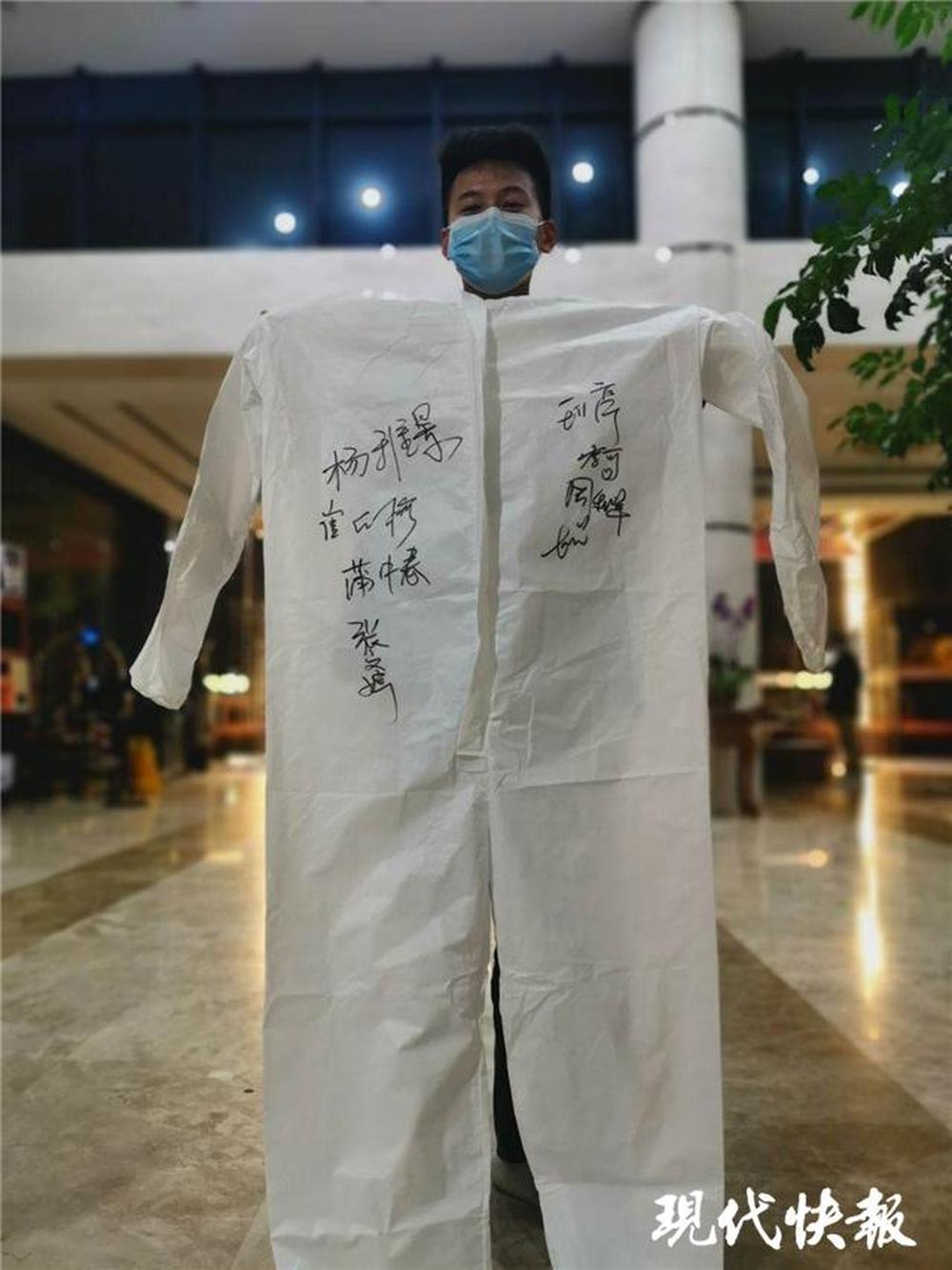 “其實他們都比我大,叫我強哥都不敢應?!标悘婌t腆地笑著。陳強還展示了一件特殊的防護服,上面寫滿了他接送的醫(yī)護人員名字?!拔蚁M词顾麄冏吡?,我也能記得他們?!?/p>