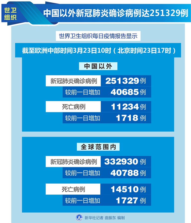 世衛(wèi)組織每日疫情報(bào)告顯示,截至歐洲中部時(shí)間23日10時(shí)(北京時(shí)間23日17時(shí)),中國以外新冠肺炎確診病例較前一日增加40685例,達(dá)到251329例;中國以外死亡病例較前一日增加1718例,達(dá)到11234例。