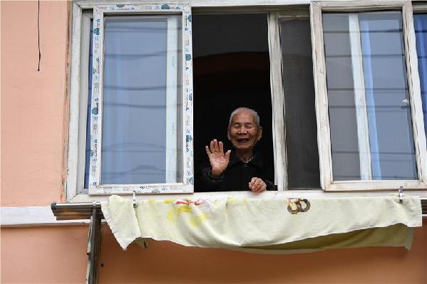 3月23日,武漢市青山區(qū)青山鎮(zhèn)街船廠社區(qū),一位爹爹在自家窗口和網格員打招呼。