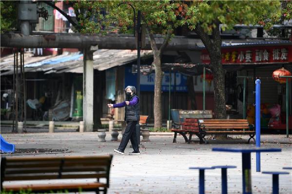 3月23日,武漢市青山區(qū)青山鎮(zhèn)街石化社區(qū),居民在小區(qū)花園內鍛煉身體。