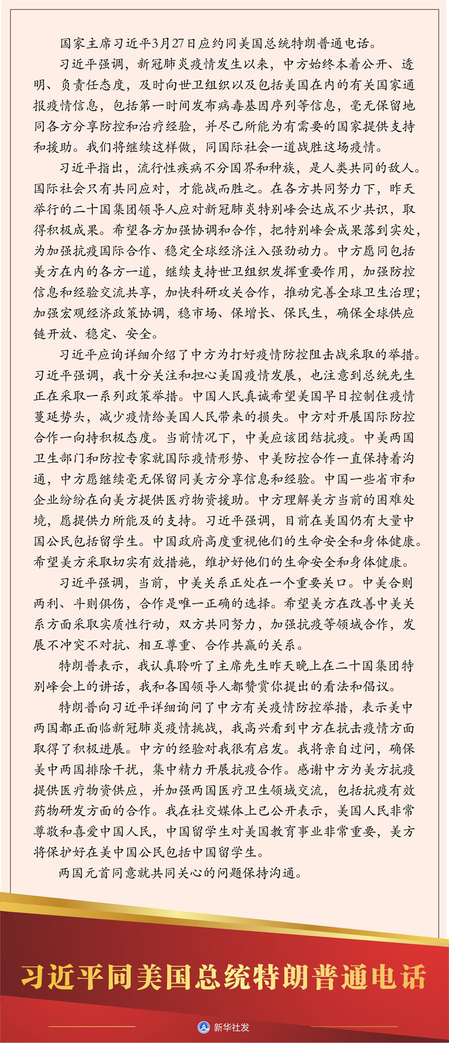 特朗普向習(xí)近平詳細(xì)詢問了中方有關(guān)疫情防控舉措,表示美中兩國都正面臨新冠肺炎疫情挑戰(zhàn),我高興看到中方在抗擊疫情方面取得了積極進(jìn)展。中方的經(jīng)驗(yàn)對我很有啟發(fā)。我將親自過問,確保美中兩國排除干擾,集中精力開展抗疫合作。感謝中方為美方抗疫提供醫(yī)療物資供應(yīng),并加強(qiáng)兩國醫(yī)療衛(wèi)生領(lǐng)域交流,包括抗疫有效藥物研發(fā)方面的合作。我在社交媒體上已公開表示,美國人民非常尊敬和喜愛中國人民,中國留學(xué)生對美國教育事業(yè)非常重要,美方將保護(hù)好在美中國公民包括中國留學(xué)生。