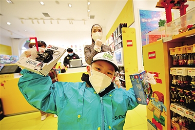 3月30日,武漢市楚河漢街重新開(kāi)街,多家主力商鋪率先營(yíng)業(yè)。圖為一位小朋友在家長(zhǎng)的帶領(lǐng)下購(gòu)買心儀的玩具。光明日?qǐng)?bào)武漢一線報(bào)道組記者蔡闖、季春紅攝/光明圖片