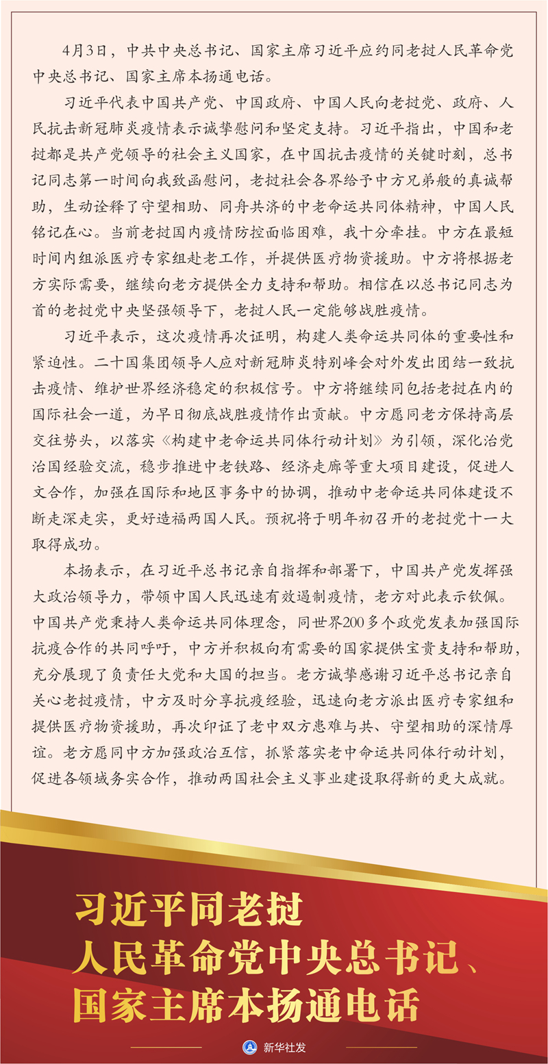 習(xí)近平代表中國(guó)共產(chǎn)黨、中國(guó)政府、中國(guó)人民向老撾黨、政府、人民抗擊新冠肺炎疫情表示誠(chéng)摯慰問(wèn)和堅(jiān)定支持。習(xí)近平指出,中國(guó)和老撾都是共產(chǎn)黨領(lǐng)導(dǎo)的社會(huì)主義國(guó)家,在中國(guó)抗擊疫情的關(guān)鍵時(shí)刻,總書(shū)記同志第一時(shí)間向我致函慰問(wèn),老撾社會(huì)各界給予中方兄弟般的真誠(chéng)幫助,生動(dòng)詮釋了守望相助、同舟共濟(jì)的中老命運(yùn)共同體精神,中國(guó)人民銘記在心。當(dāng)前老撾國(guó)內(nèi)疫情防控面臨困難,我十分牽掛。中方在最短時(shí)間內(nèi)組派醫(yī)療專(zhuān)家組赴老工作,并提供醫(yī)療物資援助。中方將根據(jù)老方實(shí)際需要,繼續(xù)向老方提供全力支持和幫助。相信在以總書(shū)記同志為首的老撾黨中央堅(jiān)強(qiáng)領(lǐng)導(dǎo)下,老撾人民一定能夠戰(zhàn)勝疫情。