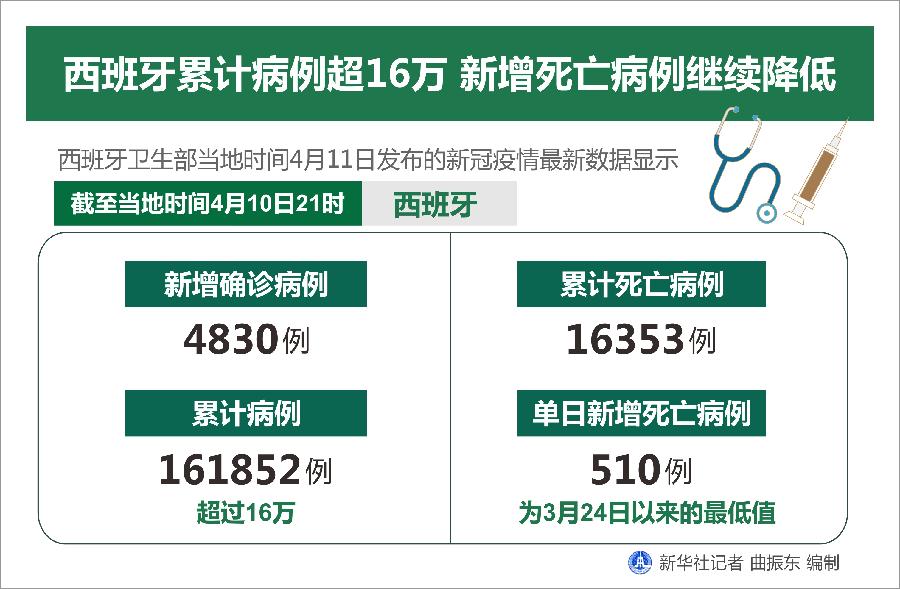 新華社馬德里4月11日電(謝宇智)西班牙衛(wèi)生部11日發(fā)布的新冠疫情最新數(shù)據(jù)顯示,截至當(dāng)?shù)貢r間10日21時,西班牙新增確診病例4830例,累計病例數(shù)超過16萬,達(dá)到161852例;累計死亡病例達(dá)16353例,單日新增死亡病例510例,為3月24日以來的最低值。