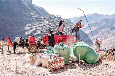 會(huì)澤縣易地扶貧搬遷的鄉(xiāng)親們?cè)谶\(yùn)送行李。