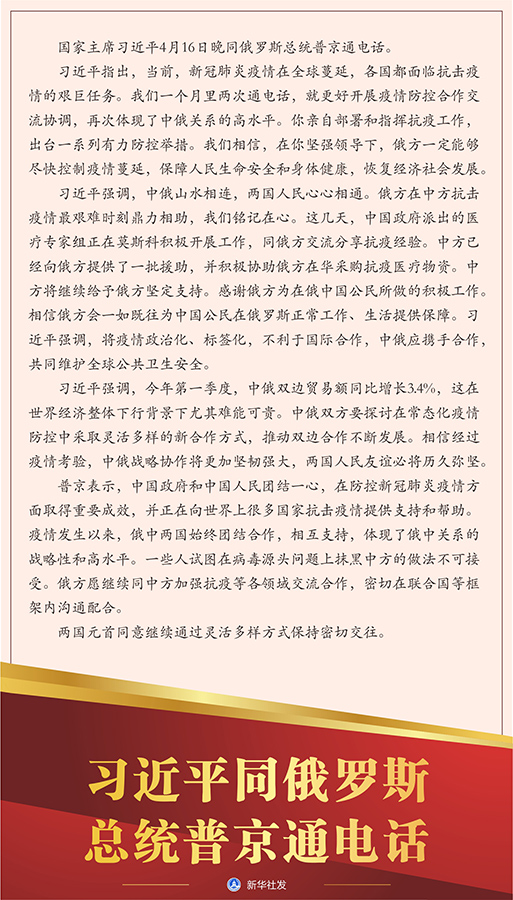 習(xí)近平強調(diào),中俄山水相連,兩國人民心心相通。俄方在中方抗擊疫情最艱難時刻鼎力相助,我們銘記在心。這幾天,中國政府派出的醫(yī)療專家組正在莫斯科積極開展工作,同俄方交流分享抗疫經(jīng)驗。中方已經(jīng)向俄方提供了一批援助,并積極協(xié)助俄方在華采購抗疫醫(yī)療物資。中方將繼續(xù)給予俄方堅定支持。感謝俄方為在俄中國公民所做的積極工作。相信俄方會一如既往為中國公民在俄羅斯正常工作、生活提供保障。習(xí)近平強調(diào),將疫情政治化、標簽化,不利于國際合作,中俄應(yīng)攜手合作,共同維護全球公共衛(wèi)生安全。
