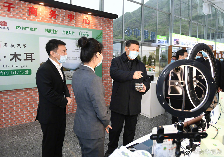 正在陜西考察的習近平總書記20日下午來到柞水縣小嶺鎮(zhèn)金米村。金米村地處秦嶺深處,近年來依靠發(fā)展木耳等產(chǎn)業(yè)擺脫了貧困。村培訓中心,幾位村民正在做網(wǎng)上直播賣貨的準備工作,總書記走到直播平臺前,同他們親切交談起來。他表示,電商作為新興業(yè)態(tài),既可以推銷農(nóng)副產(chǎn)品、幫助群眾脫貧致富,又可以推動鄉(xiāng)村振興,是大有可為的。(文字記者:張曉松 攝影記者:鞠鵬、謝環(huán)馳、燕雁、翟健嵐)