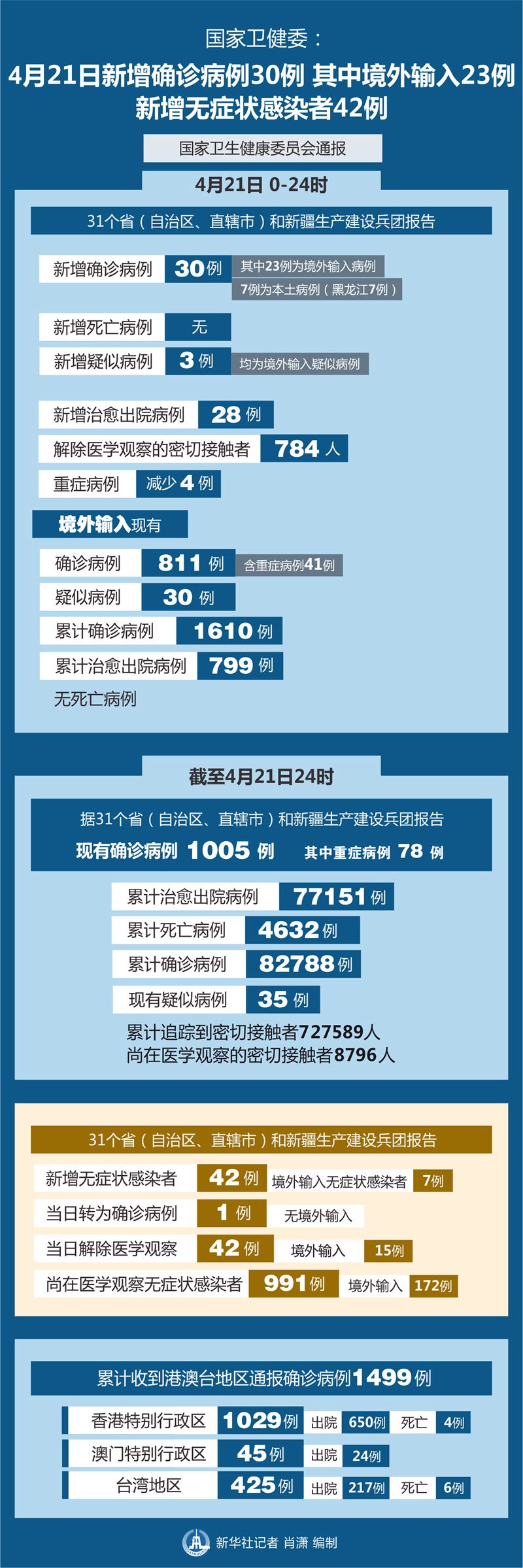 截至4月21日24時,據(jù)31個省(自治區(qū)、直轄市)和新疆生產(chǎn)建設兵團報告,現(xiàn)有確診病例1005例(其中重癥病例78例),累計治愈出院病例77151例,累計死亡病例4632例,累計報告確診病例82788例,現(xiàn)有疑似病例35例。累計追蹤到密切接觸者727589人,尚在醫(yī)學觀察的密切接觸者8796人。