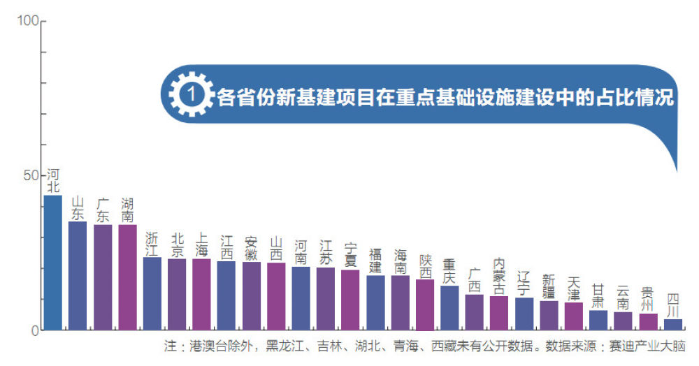 通過(guò)搜集分析全國(guó)已經(jīng)公開(kāi)的26個(gè)省份年度重點(diǎn)基礎(chǔ)設(shè)施項(xiàng)目投資計(jì)劃,按照官方文件中提到的5G、數(shù)據(jù)中心、物聯(lián)網(wǎng)、工業(yè)互聯(lián)網(wǎng)等作為新型基礎(chǔ)設(shè)施的口徑標(biāo)準(zhǔn),本刊計(jì)算了各省市新基建項(xiàng)目在重點(diǎn)基礎(chǔ)設(shè)施建設(shè)中的占比情況。(見(jiàn)圖1)