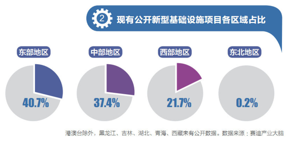 據(jù)統(tǒng)計(jì),納入省級(jí)重點(diǎn)投資計(jì)劃的新型基礎(chǔ)設(shè)施項(xiàng)目,東部地區(qū)共有406項(xiàng)、中部地區(qū)373項(xiàng)、西部地區(qū)216項(xiàng),而東北地區(qū)僅有2項(xiàng)。(見(jiàn)圖2)