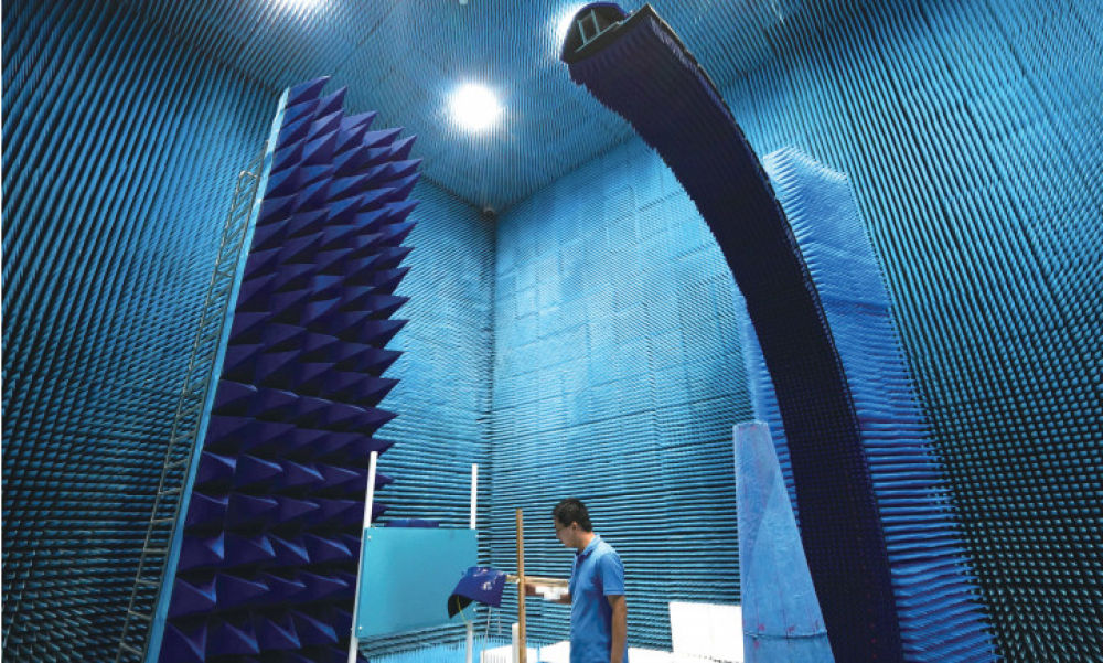 2019年6月6日,在江蘇南京江寧經(jīng)濟(jì)技術(shù)開發(fā)區(qū),科研人員在網(wǎng)絡(luò)通信與安全紫金山實(shí)驗室的微波暗室內(nèi)工作。該實(shí)驗室已經(jīng)宣布成功研發(fā)5G移動通信核心的毫米波芯片(李響/攝)