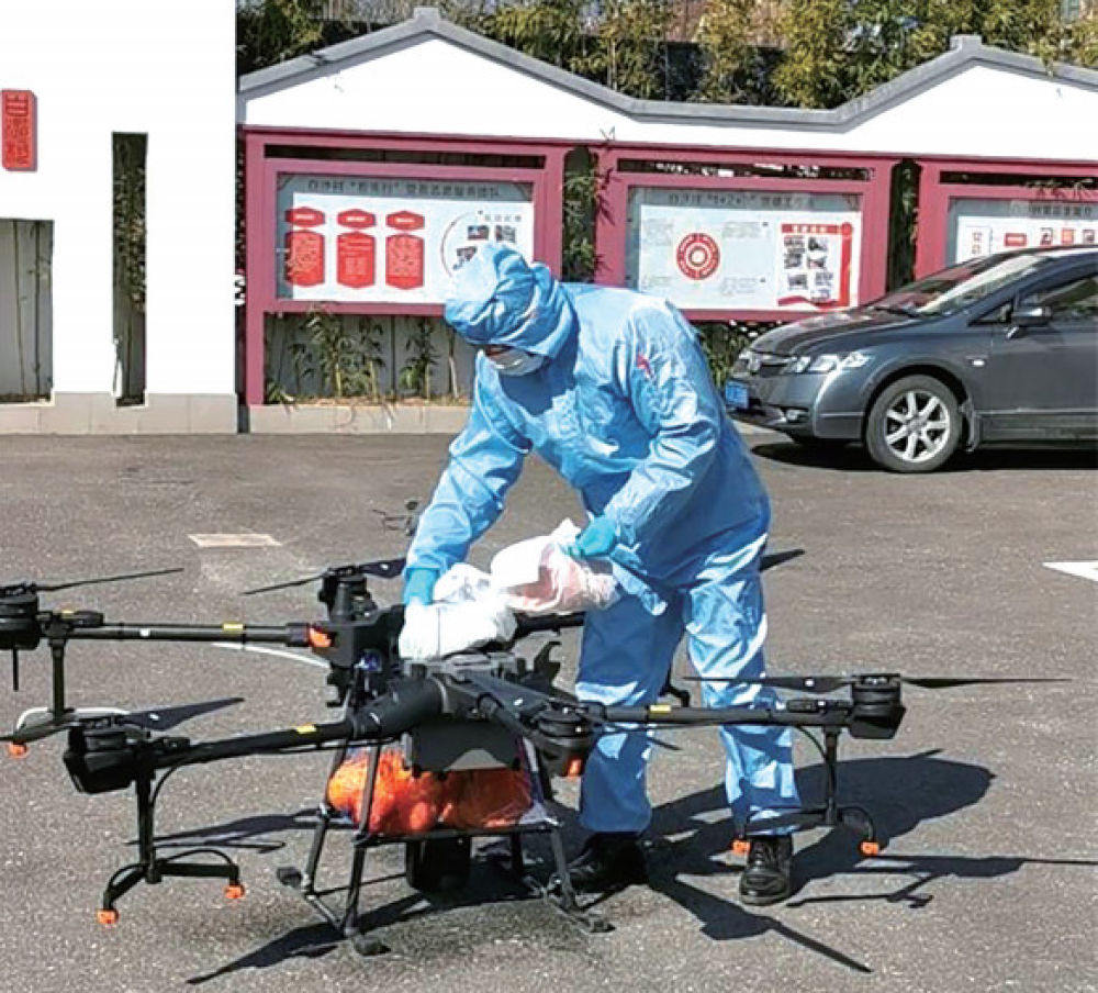 2月18日,上海市公安局治安總隊?wèi)?yīng)用無人機(jī)對白沙村居家隔離重點(diǎn)人員投遞食物和防疫物資