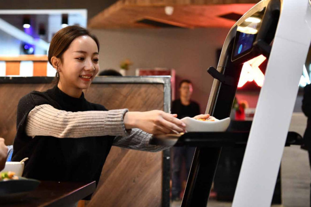 2018年11月10日,中新天津生態(tài)城“X 未來餐廳”,顧客通過自動駕駛機(jī)器人取菜(李然/攝)