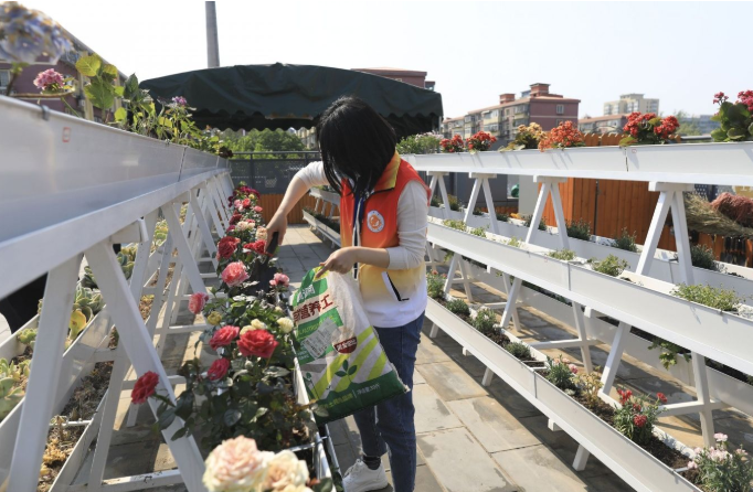 4月27日,海淀區(qū)學院路街道二里莊社區(qū),“廚余垃圾資源化一體機”轉(zhuǎn)化出來的營養(yǎng)土經(jīng)過晾曬后,用于屋頂花園的花草種植。攝影/新京報記者 浦峰