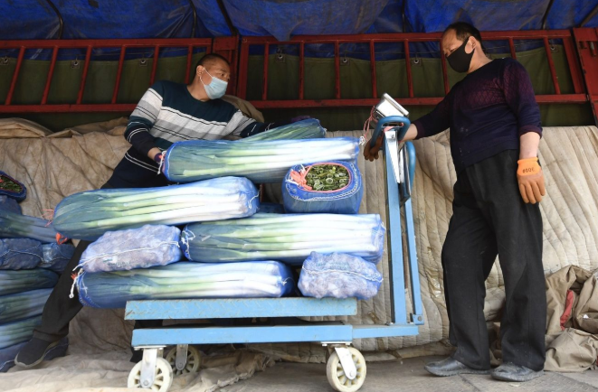 4月13日,新發(fā)地市場,批發(fā)商正在對來自上海的凈蔥進行過秤。為實現(xiàn)垃圾減量,新發(fā)地鼓勵商戶“凈菜進京”,大蔥、洋蔥等“主菜”在產(chǎn)地裝車時,就去掉了多余部分。