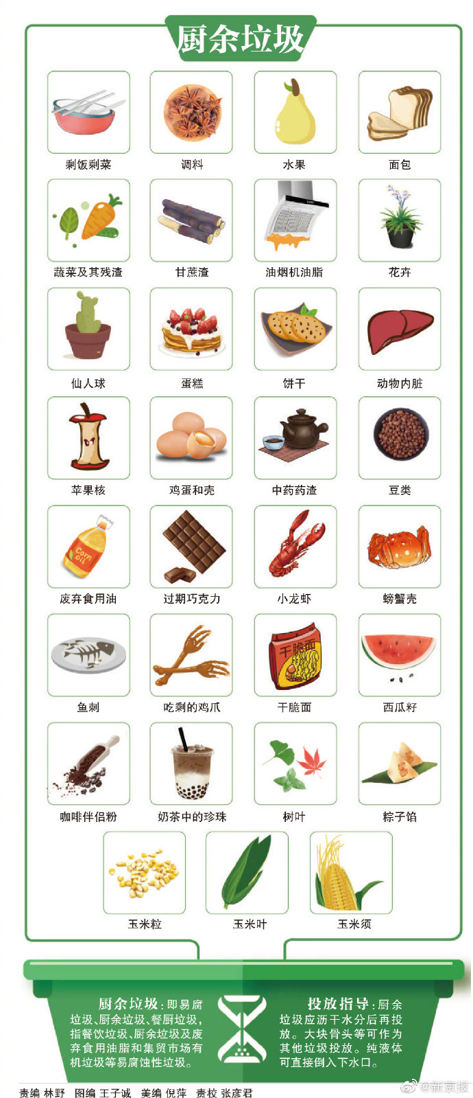 “廚余垃圾”,指家庭中產(chǎn)生的菜幫菜葉、瓜果皮核、剩菜剩飯、廢棄食物等易腐垃圾;企業(yè)和機關(guān)、部隊、學校、企業(yè)事業(yè)等單位集體食堂產(chǎn)生的食物殘渣、食品加工廢料和廢棄食用油脂;以及農(nóng)貿(mào)市場、農(nóng)產(chǎn)品批發(fā)市場產(chǎn)生的蔬菜瓜果垃圾、腐肉、肉碎骨、水產(chǎn)品、畜禽內(nèi)臟等。