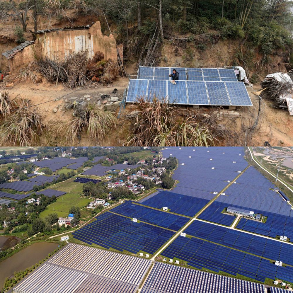 (上圖:2015年1月28日,金寨縣全軍鄉(xiāng)沙河店村村民在擦拭自家后院的光伏發(fā)電板,新華社記者劉軍喜攝;下圖:2017年9月14日,金寨縣小南京光伏農業(yè)生態(tài)園全景。新華社記者陶明攝)