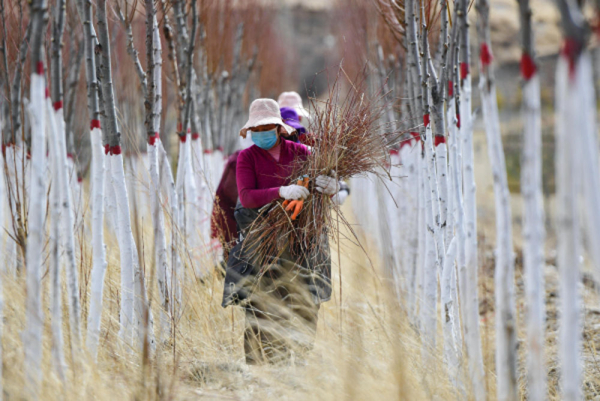 當(dāng)?shù)厝罕娫谟駱涓咴М€林木良種繁育實(shí)驗(yàn)基地清理樹枝 張龍 攝