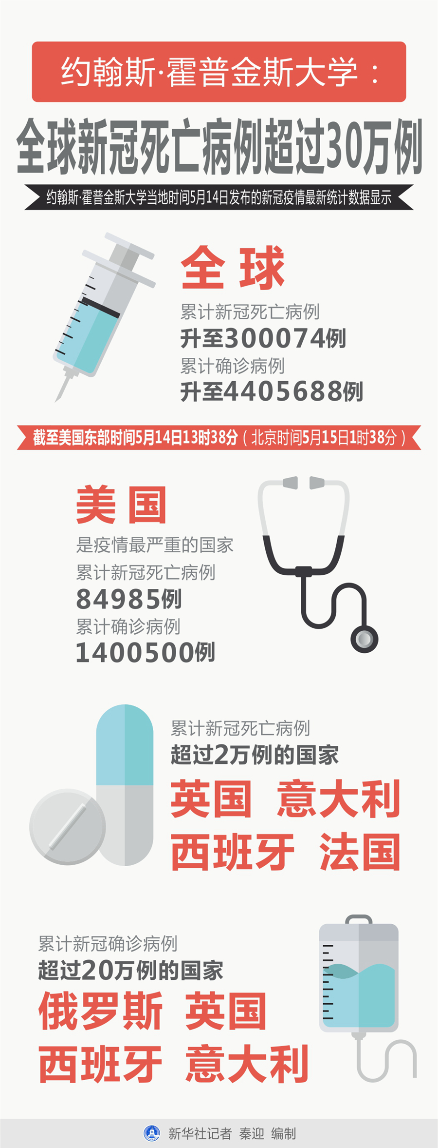 新華社紐約5月14日電 美國(guó)約翰斯·霍普金斯大學(xué)14日發(fā)布的新冠疫情最新統(tǒng)計(jì)數(shù)據(jù)顯示,全球累計(jì)新冠死亡病例超過(guò)30萬(wàn)例。
