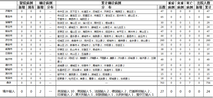 山東無本地住院疑似病例、確診病例。累計(jì)報(bào)告確診病例763例,死亡7例,治愈出院756例。