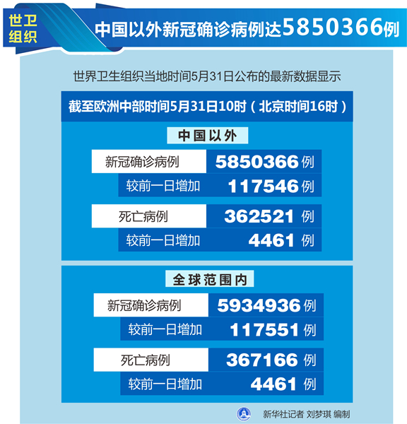 新華社日內(nèi)瓦5月31日電(記者劉曲)世界衛(wèi)生組織31日公布的最新數(shù)據(jù)顯示,中國(guó)以外新冠確診病例達(dá)到5850366例。