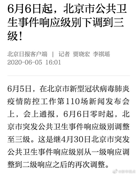 6月5日,在北京市新型冠狀病毒肺炎疫情防控工作第110場(chǎng)新聞發(fā)布會(huì)上,會(huì)上通報(bào),6月6日零時(shí)起,北京市突發(fā)公共衛(wèi)生事件響應(yīng)級(jí)別調(diào)整至三級(jí)。這是繼4月30日北京市突發(fā)公共衛(wèi)生事件響應(yīng)級(jí)別從一級(jí)響應(yīng)調(diào)整到二級(jí)響應(yīng)之后的再次調(diào)整。?