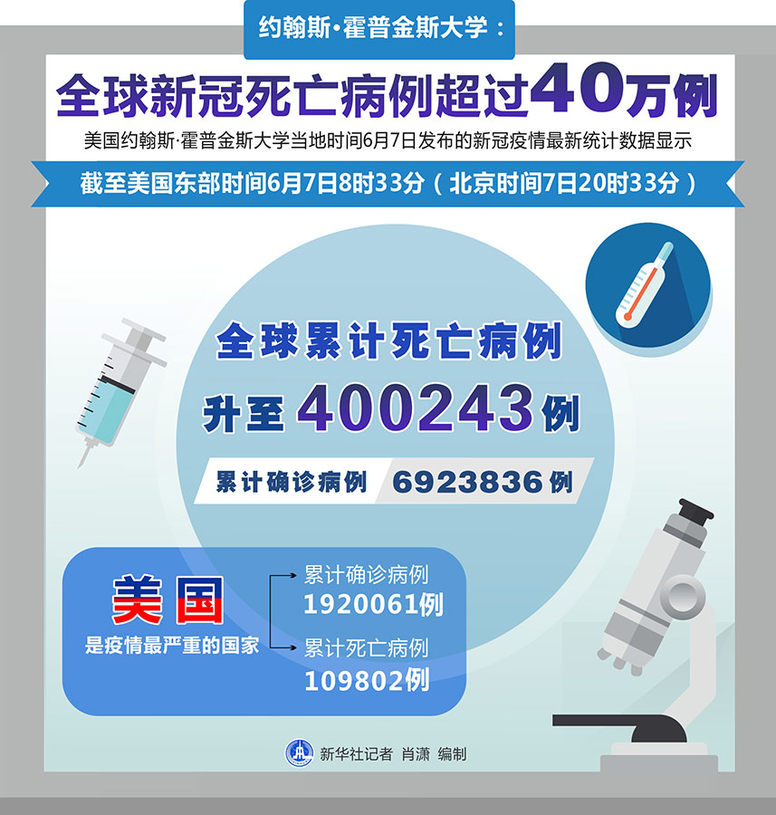 新華社紐約6月7日電 美國(guó)約翰斯·霍普金斯大學(xué)7日發(fā)布的新冠疫情最新統(tǒng)計(jì)數(shù)據(jù)顯示,全球累計(jì)死亡病例超過(guò)40萬(wàn)例。