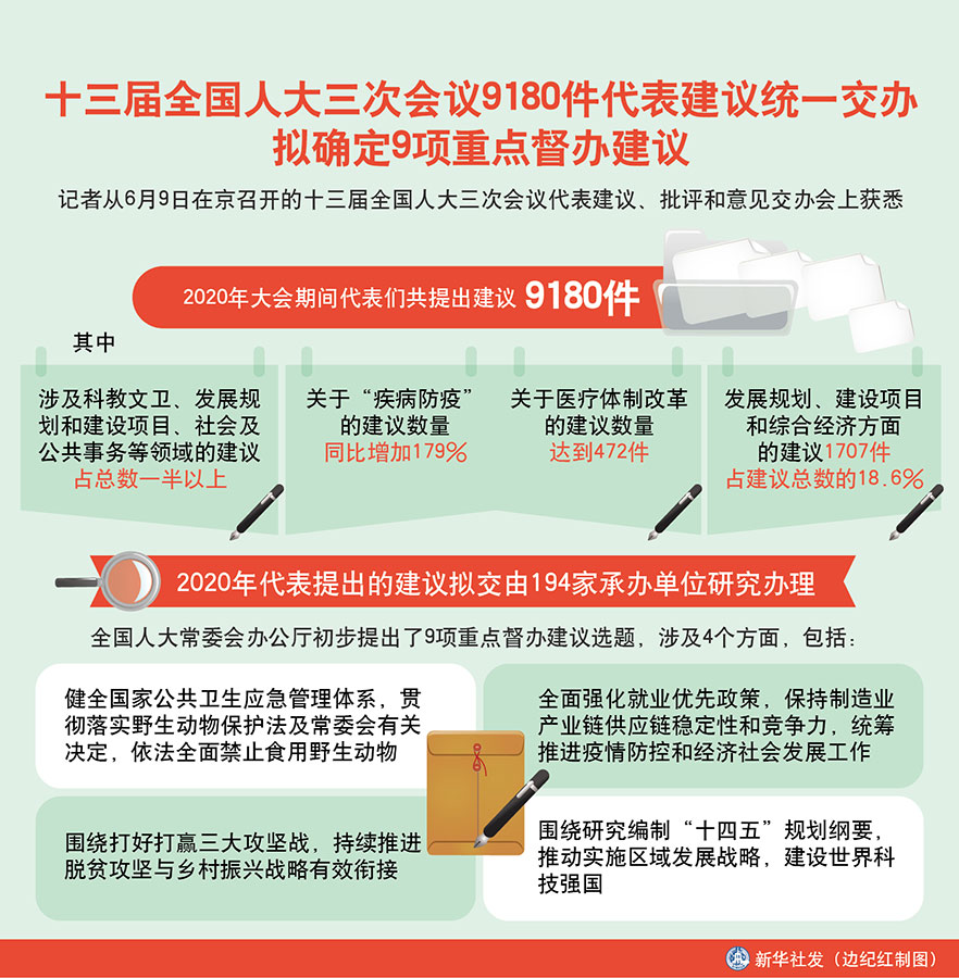按照代表法有關(guān)規(guī)定,今年代表提出的建議擬交由194家承辦單位研究辦理。全國人大常委會(huì)辦公廳初步提出了9項(xiàng)重點(diǎn)督辦建議選題,涉及4個(gè)方面,包括:健全國家公共衛(wèi)生應(yīng)急管理體系,貫徹落實(shí)野生動(dòng)物保護(hù)法及常委會(huì)有關(guān)決定,依法全面禁止食用野生動(dòng)物;全面強(qiáng)化就業(yè)優(yōu)先政策,保持制造業(yè)產(chǎn)業(yè)鏈供應(yīng)鏈穩(wěn)定性和競爭力,統(tǒng)籌推進(jìn)疫情防控和經(jīng)濟(jì)社會(huì)發(fā)展工作;圍繞打好打贏三大攻堅(jiān)戰(zhàn),持續(xù)推進(jìn)脫貧攻堅(jiān)與鄉(xiāng)村振興戰(zhàn)略有效銜接;圍繞研究編制“十四五”規(guī)劃綱要,推動(dòng)實(shí)施區(qū)域發(fā)展戰(zhàn)略,建設(shè)世界科技強(qiáng)國。