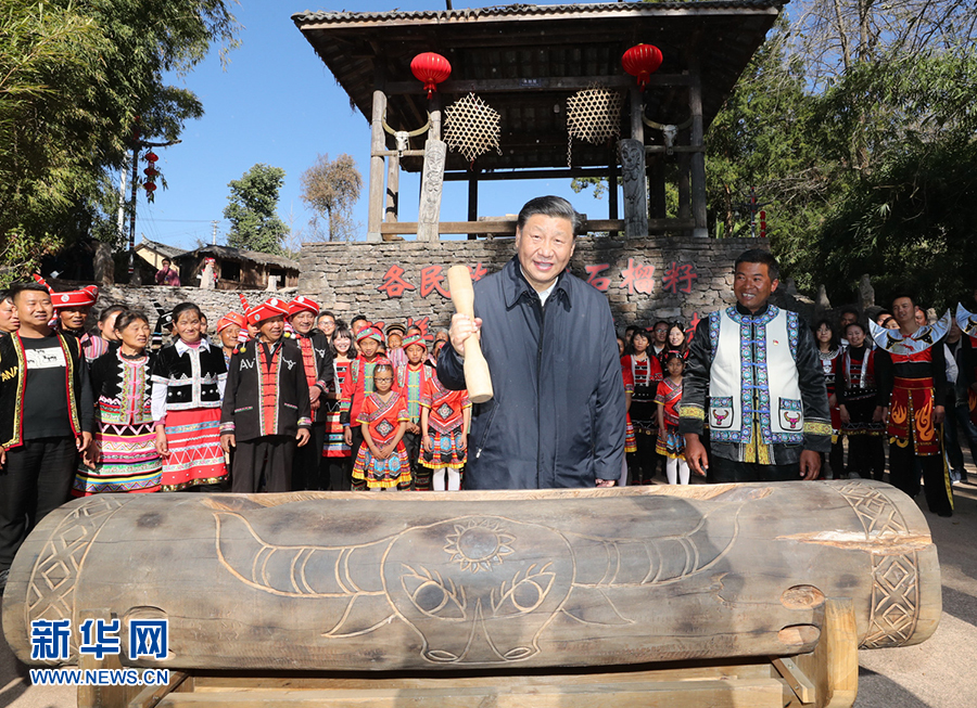 今年1月19日,正在云南考察的習(xí)近平來到騰沖市清水鄉(xiāng)三家村中寨司莫拉佤族村。司莫拉,佤語意為“幸福的地方”。習(xí)近平說,在大家努力下,你們這里已經(jīng)實(shí)現(xiàn)脫貧并正向新的發(fā)展目標(biāo)努力邁進(jìn),可喜可賀。全面建成小康社會(huì)之后要全面推進(jìn)鄉(xiāng)村振興,讓幸福的佤族村更加幸福!按照當(dāng)?shù)亓?xí)俗,習(xí)近平拿起鼓棒,敲響三聲木鼓,祝福風(fēng)調(diào)雨順、國泰民安、四海升平,并向鄉(xiāng)親們致以新春祝福。