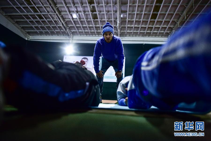 在青海省海東市互助土族自治縣的網(wǎng)球場內(nèi),喬西·羅賓遜帶領(lǐng)學(xué)員進(jìn)行拉伸運(yùn)動(dòng)(2019年11月7日攝)。 新華社記者吳剛攝