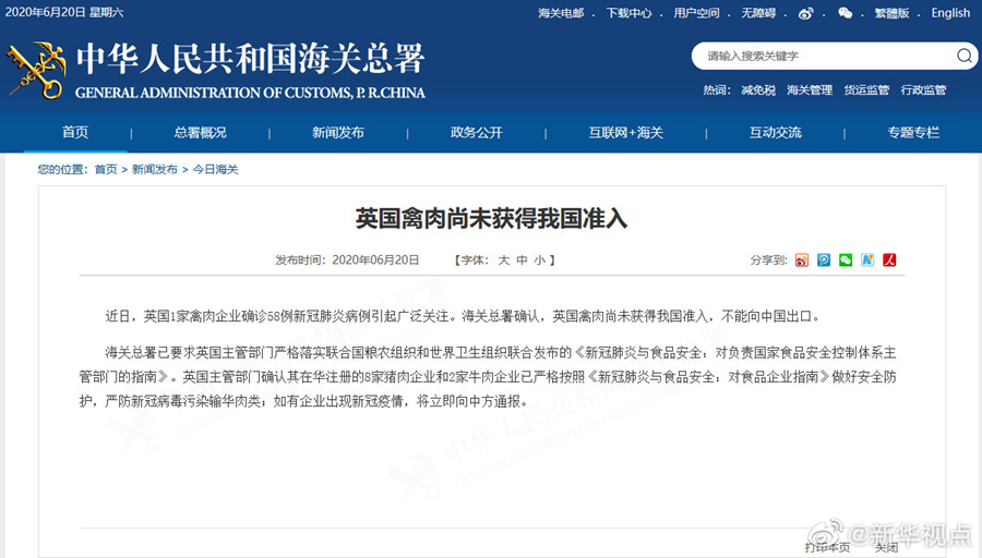 海關(guān)總署20日發(fā)布公告說,近日英國(guó)一家禽肉企業(yè)確診58例新冠肺炎病例引起廣泛關(guān)注。海關(guān)總署確認(rèn),英國(guó)禽肉尚未獲得我國(guó)準(zhǔn)入,不能向中國(guó)出口。海關(guān)總署已要求英國(guó)主管部門嚴(yán)格落實(shí)聯(lián)合國(guó)糧農(nóng)組織和世界衛(wèi)生組織聯(lián)合發(fā)布的《新冠肺炎與食品安全:對(duì)負(fù)責(zé)國(guó)家食品安全控制體系主管部門的指南》。英國(guó)主管部門確認(rèn)其在華注冊(cè)的8家豬肉企業(yè)和2家牛肉企業(yè)已嚴(yán)格按照《新冠肺炎與食品安全:對(duì)食品企業(yè)指南》做好安全防護(hù),嚴(yán)防新冠病毒污染輸華肉類;如有企業(yè)出現(xiàn)新冠疫情,將立即向中方通報(bào)。(記者劉紅霞)