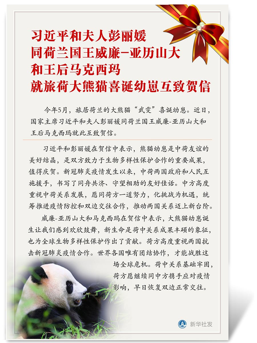 習(xí)近平和彭麗媛在賀信中表示,熊貓幼崽是中荷友誼的美好結(jié)晶,是雙方致力于生物多樣性保護(hù)合作的重要成果,值得慶賀。新冠肺炎疫情發(fā)生以來,中荷兩國政府和人民互施援手,書寫了同舟共濟(jì)、守望相助的友好佳話。中方高度重視中荷關(guān)系發(fā)展,愿同荷方一道努力,化挑戰(zhàn)為機(jī)遇,統(tǒng)籌推進(jìn)疫情防控和雙邊交往合作,推動(dòng)兩國關(guān)系邁上新臺(tái)階。