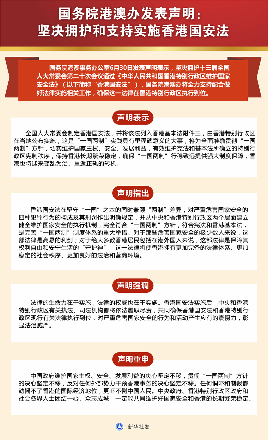 聲明指出,香港國安法在堅守“一國”之本的同時兼顧“兩制”差異,對嚴重危害國家安全的四種犯罪行為的構(gòu)成及其刑罰作出明確規(guī)定,并從中央和香港特別行政區(qū)兩個層面建立健全維護國家安全的執(zhí)行機制,完全符合“一國兩制”方針,符合憲法和香港基本法,是完善“一國兩制”制度體系的重大舉措。對于那些危害國家安全的極少數(shù)人來說,這部法律是高懸的利劍;對于絕大多數(shù)香港居民包括在港外國人來說,這部法律是保障其權(quán)利自由和安寧生活的“守護神”。這一法律將使香港擁有更加完備的法律體系、更加穩(wěn)定的社會秩序、更加良好的法治和營商環(huán)境。