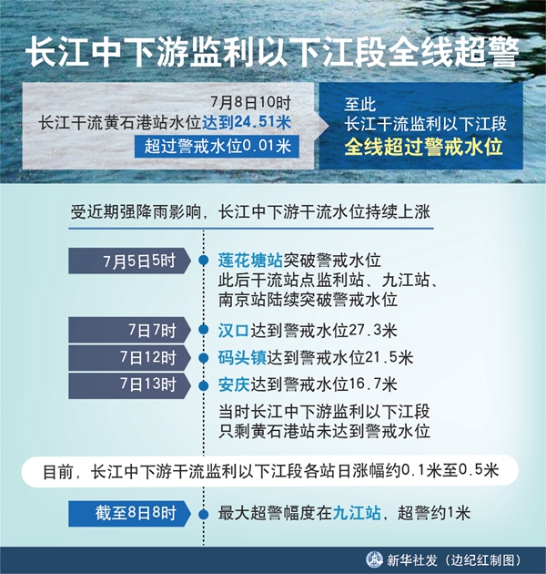 新華社武漢7月8日電(記者李思遠(yuǎn)、樂(lè)文婉)8日10時(shí),長(zhǎng)江干流黃石港站水位達(dá)到24.51米,超過(guò)警戒水位0.01米。至此,長(zhǎng)江干流監(jiān)利以下江段全線超過(guò)警戒水位。