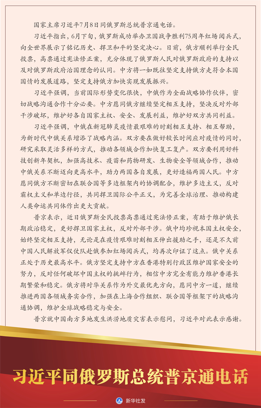 習(xí)近平指出,6月下旬,俄羅斯成功舉辦衛(wèi)國戰(zhàn)爭勝利75周年紅場閱兵式,向全世界展示了銘記歷史、捍衛(wèi)和平的堅定決心。日前,俄方順利舉行全民投票,高票通過憲法修正案,充分體現(xiàn)了俄羅斯人民對俄羅斯政府的支持以及對俄羅斯政府治國理念的認同。中方將一如既往堅定支持俄方走符合本國國情的發(fā)展道路,堅定支持俄方加快實現(xiàn)發(fā)展振興。