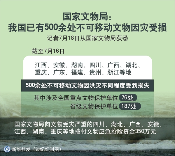 新華社北京7月18日電(記者施雨岑)記者18日從國家文物局獲悉,截至7月16日,江西、安徽、湖南、四川、廣西、湖北、重慶、廣東、福建、貴州、浙江等地500余處不可移動文物因洪災(zāi)不同程度受到損失,其中涉及全國重點(diǎn)文物保護(hù)單位76處、省級文物保護(hù)單位187處。